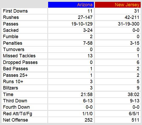 Arizona scored a touchdown with just under 3 minutes in the game to avoid the shutout. Other than that, they lost in every facet of the game. New Jersey doubled them up on time of possession even.