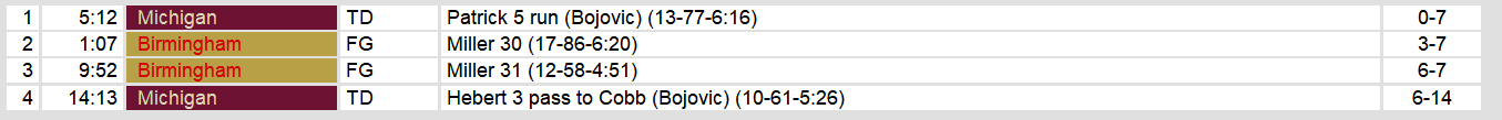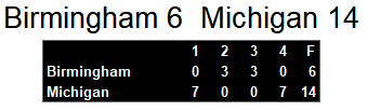 Birmingham quarterback Cliff Stoudt had been throwing touchdowns at will. But, Michigan’s defense turned back the clock for one week. He passed for only 162 yards and no touchdowns. Michigan intercepted him twice in the game.