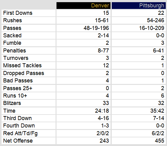 Pittsburgh doubled up Denver Saturday afternoon. Quarterback Glenn Carano took control. He threw for a touchdown and ran for one, too. Meanwhile, the Pittsburgh defense held Denver to under 250 total yards in the game.