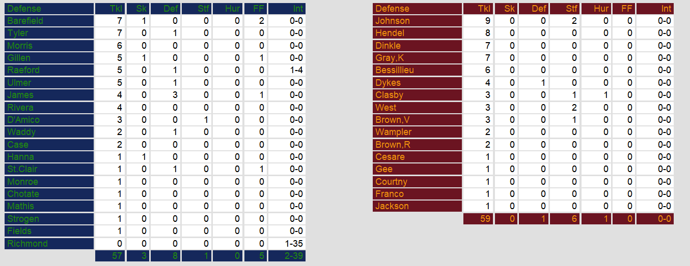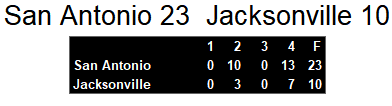In spite of gaining more yards than San Antonio, Jacksonville never really got started on offense. They gained less than 60 yards rushing in the game. The game marks a low point in the season for the Bulls, who fell to 1-7 with the loss.