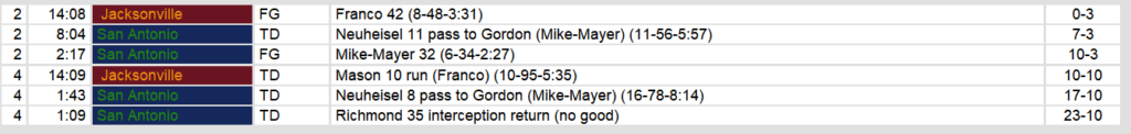 San Antonio defeated Jacksonville Saturday afternoon. Quarterback Rick Neuheisel threw for two touchdowns in the game. The defense wrapped up the scoring with an interception return for a touchdown with only a minute left in the game.