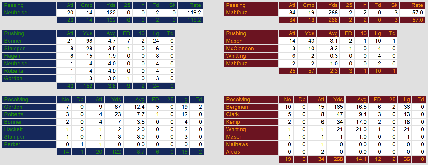 In spite of gaining more yards than San Antonio, Jacksonville never really got started on offense. They gained less than 60 yards rushing in the game. The game marks a low point in the season for the Bulls, who fell to 1-7 with the loss.