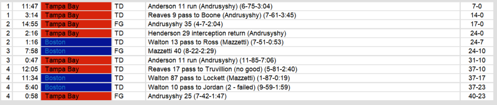 Boston’s offense came primarily from their quarterback, Johnnie Walton. He threw three touchdowns in the game. Their run game gained less than 80 yards. And their defense just had no answer for Tampa Bay’s potent offense.