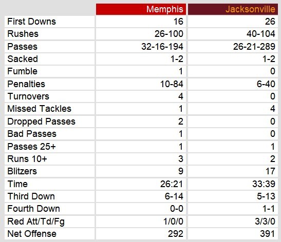 Jacksonville surprised Memphis on Friday evening. They built a 21-7 halftime lead and held on for the win by scoring the only touchdown in the second half. Quarterback Robbie Mahfouz threw for almost 300 yards and 2 touchdowns. The defense also forced four turnovers.
