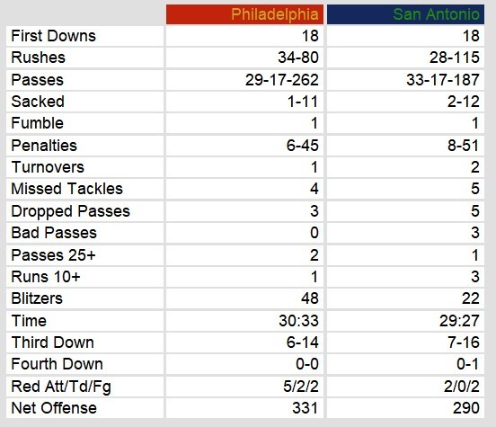 Philadelphia took care of business in San Antonio Sunday afternoon. Behind strong performances by Chuck Fusina and Kelvin Bryant, they scored 26 points in the game. Their defense held San Antonio under 300 yards in the game.
