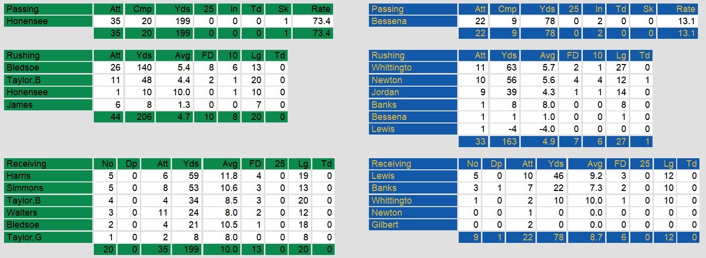 Oakland edged Washington on Sunday evening. They trailed the entire game in spite of holding the Federals to only field goals. Running back Tom Newton put them over the line with a touchdown about halfway through the 4th quarter.