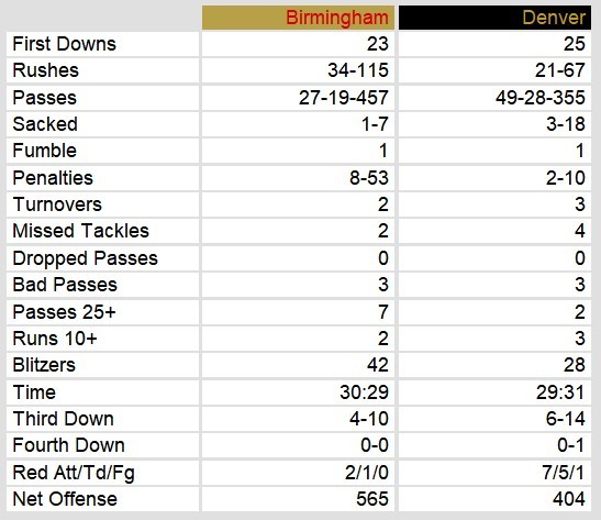 Denver scored twice in the fourth quarter in an attempt to keep the score respectable. But Birmingham matched them with a touchdown of their own and a field goal. The win keeps the Stallions on pace with the South division leading Bandits.