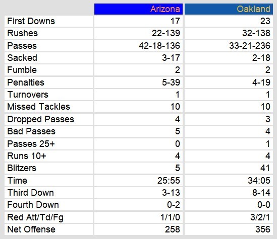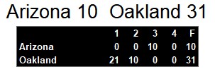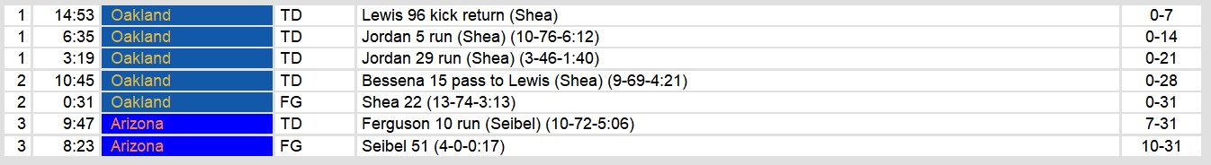 Oakland took care of business against Arizona Sunday evening. They won by a score of 31-10. The scoring kicked off (pun fully intended) with the opening kickoff returned for a touchdown. Oakland’s offense then kicked into gear with two rushes and one pass for a touchdown.