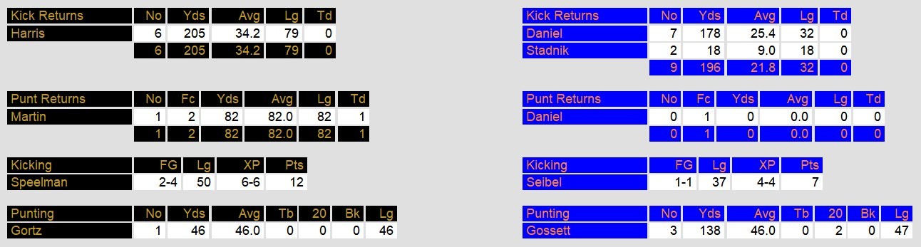 Rushing statistics revealed a strong performance by Denver’s Sydney, Mathews, and Mortensen, while Arizona’s Canada and Ferguson contributed significantly. The receiving game saw Hicks, Harris, and Sydney making notable contributions for Denver, and Anderson and Haines showcasing their skills for Arizona.
