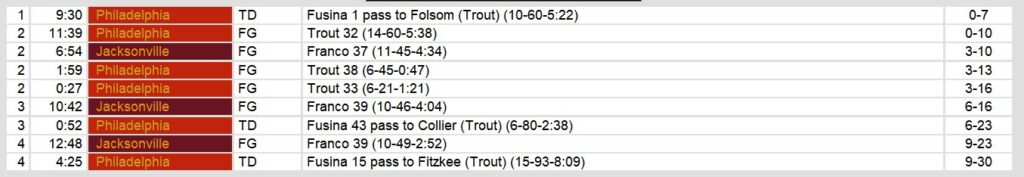 Rushing statistics revealed a strong performance by Philadelphia’s Bryant and Harvin, while Jacksonville struggled to gain significant yardage on the ground. Fusina’s passing game was well-distributed among various receivers, with Collier, Folsom, and Fitzkee making notable contributions.