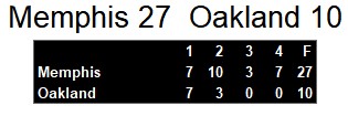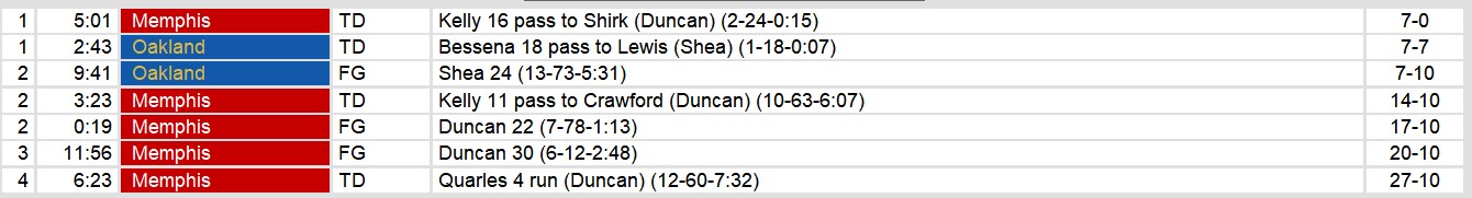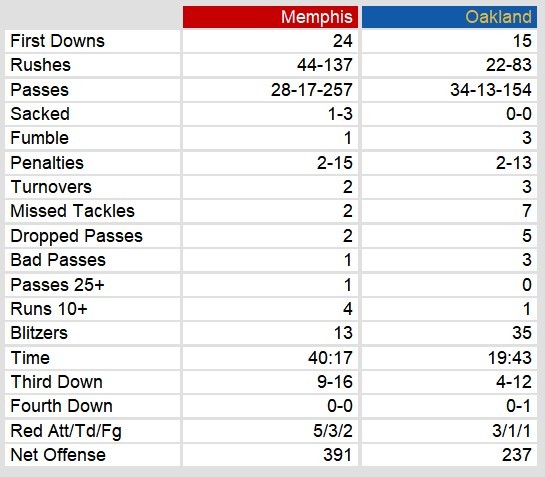 Key statistics show that Memphis led in first downs (24 to 15), rushing yards (137 to 83), and net offense (391 to 237). Memphis maintained control of the game, with a time of possession of 40:17 compared to Oakland’s 19:43.