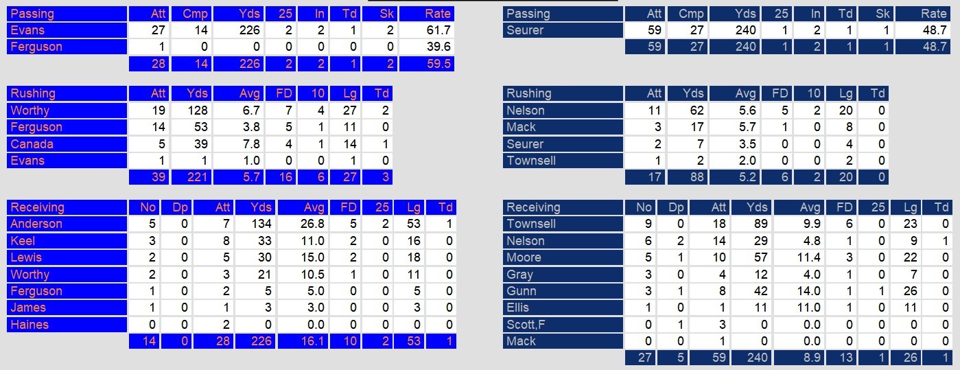 • Los Angeles’ Nelson led the rushing efforts with 62 yards, while Seurer completed 27 of 59 passes for 240 yards and one touchdown.