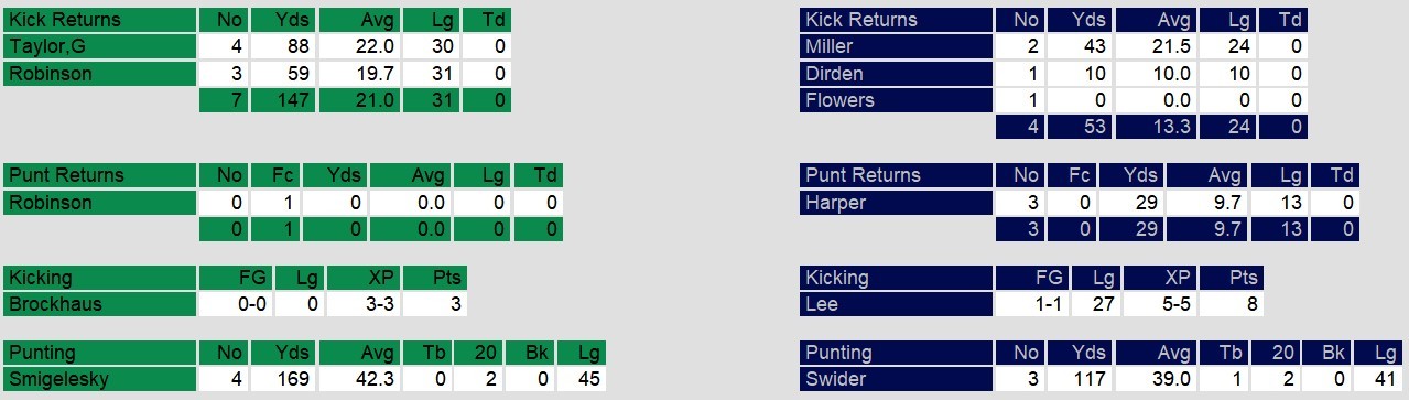 • Washington’s Collier had 281 passing yards and three touchdowns, connecting with Taylor, Bledsoe, and Taylor for scores. On the ground, Bledsoe and Taylor contributed a total of 99 rushing yards.
