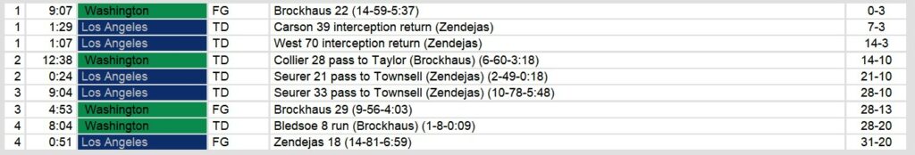 In a decisive clash between the Los Angeles Express and the Washington Federals, the Express emerged victorious with a final score of 31-20. The game showcased a remarkable defensive performance by the Express, as evidenced by two interception returns for touchdowns in the first quarter. Defensive backs Carson and West intercepted passes and swiftly turned them into scores, setting the tone for Los Angeles early on. Washington responded with a touchdown pass from Collier to Taylor, but the Express maintained their lead. Quarterback Seurer connected with Townsell twice for touchdowns, contributing significantly to the Express’ offensive efforts. Despite a resilient effort from the Federals, including a touchdown run by Bledsoe in the fourth quarter, the Express secured the win with a balanced display of offensive and defensive prowess. The game featured notable plays, including a 70-yard interception return by West and a 39-yard interception return by Carson. With this victory, the Los Angeles Express improved their season record to 11-4, while the Washington Federals concluded their season with a 6-9 record.
