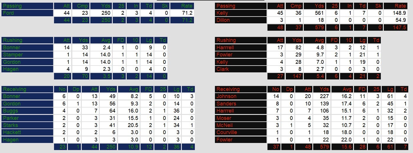 The statistical duel between the quarterbacks was nothing short of remarkable. Kelly, with an impressive 561 passing yards and 7 touchdowns, showcased his aerial mastery. On the other side, Ford battled valiantly, amassing 250 passing yards and 3 touchdowns, navigating through Houston’s defensive challenges.