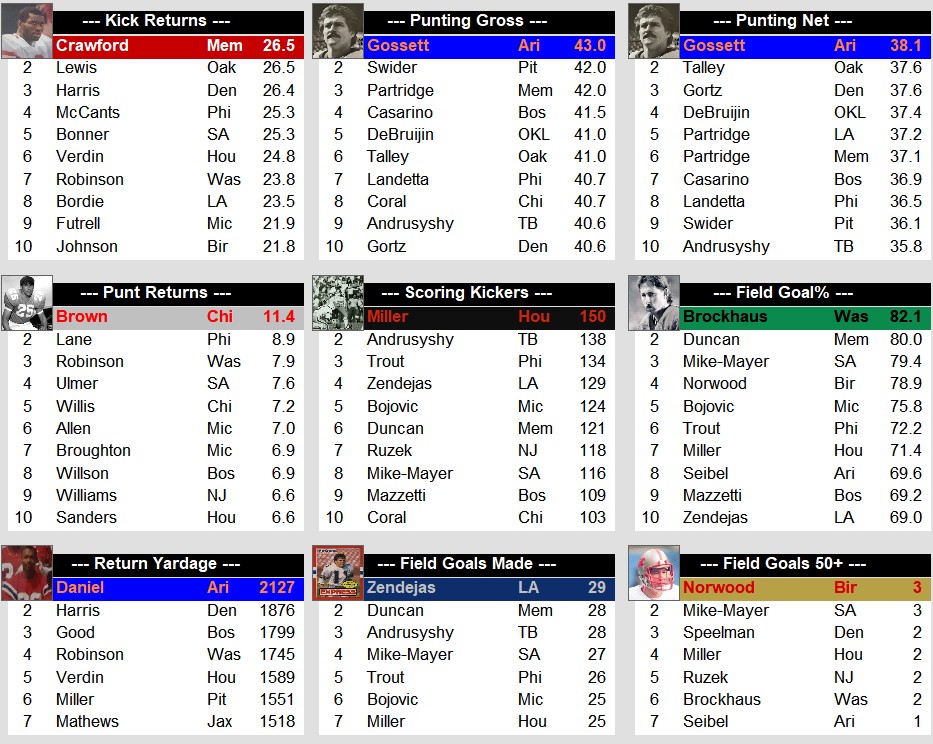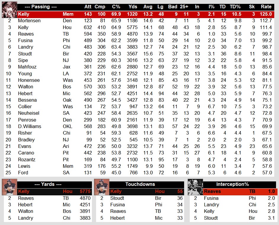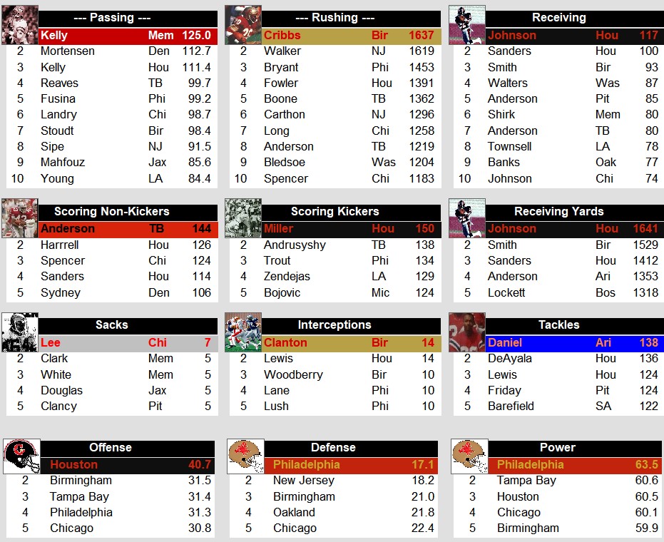USFL Stat Leaders After Week 17 (1984) Stats Weekly Stats January 24, 2024January 24, 2024 Snapshot Passing Rushing Defense Special Teams Team Stats