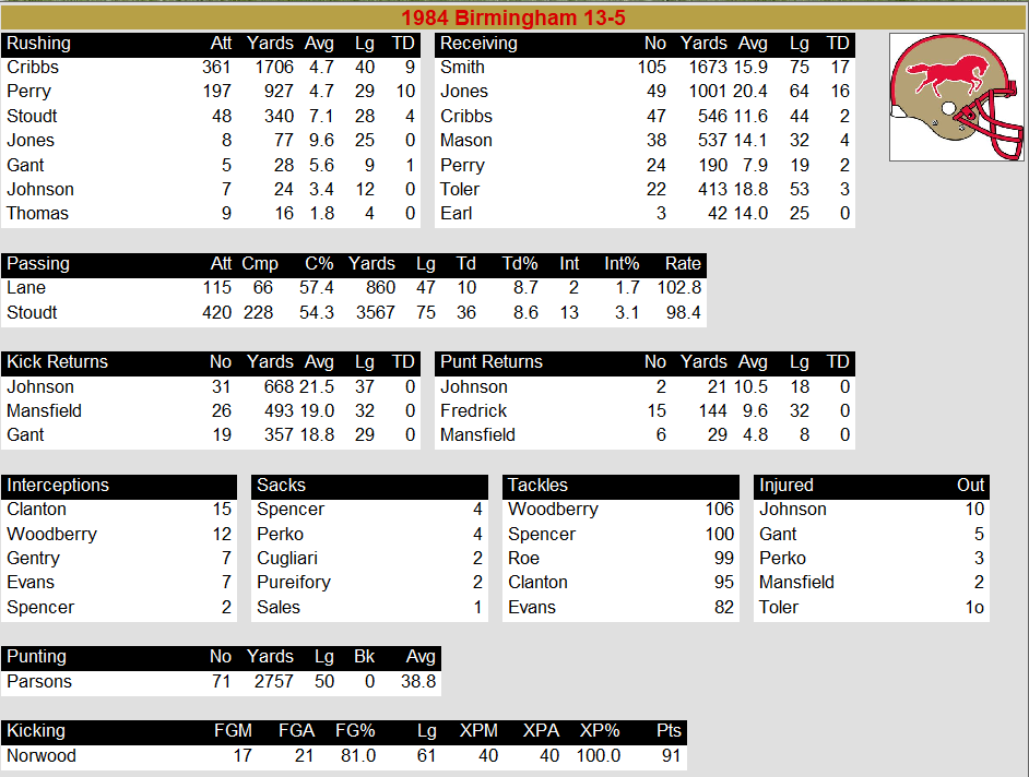 1984 Birmingham Stallions Team Stats