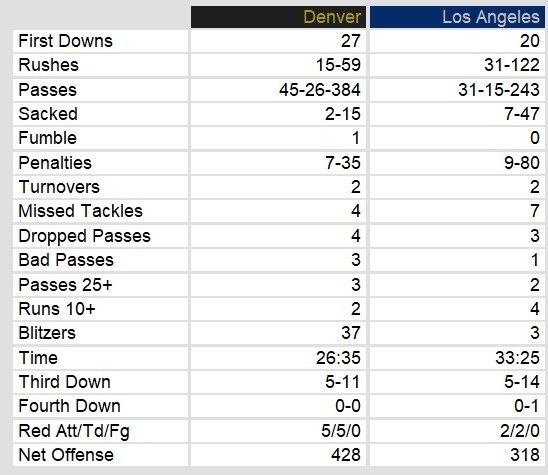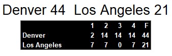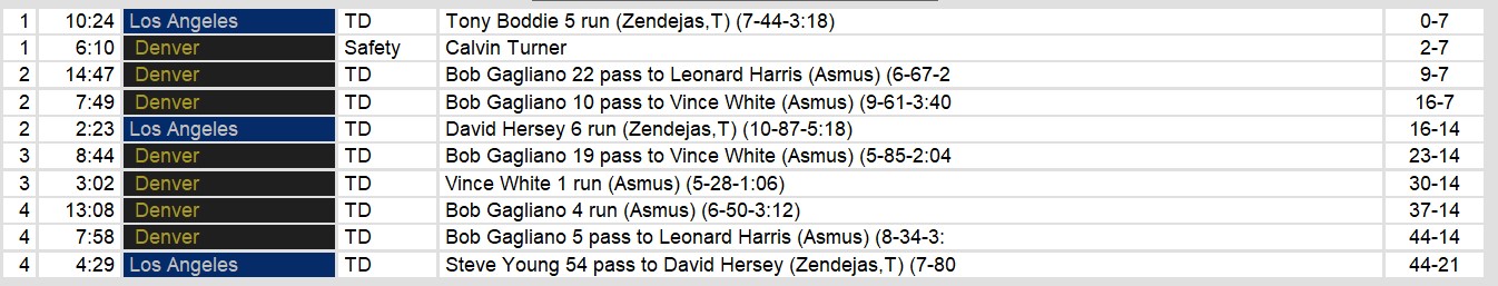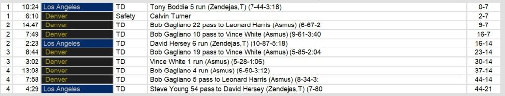 The second quarter saw Denver taking control with Gagliano throwing two touchdown passes, one to Harris and another to White. Los Angeles kept the game close with a touchdown run by David Hersey, but Denver maintained their lead heading into halftime. In the third quarter, Denver continued to dominate, with Gagliano finding White for another touchdown and White adding a rushing touchdown of his own, making it 30-14.