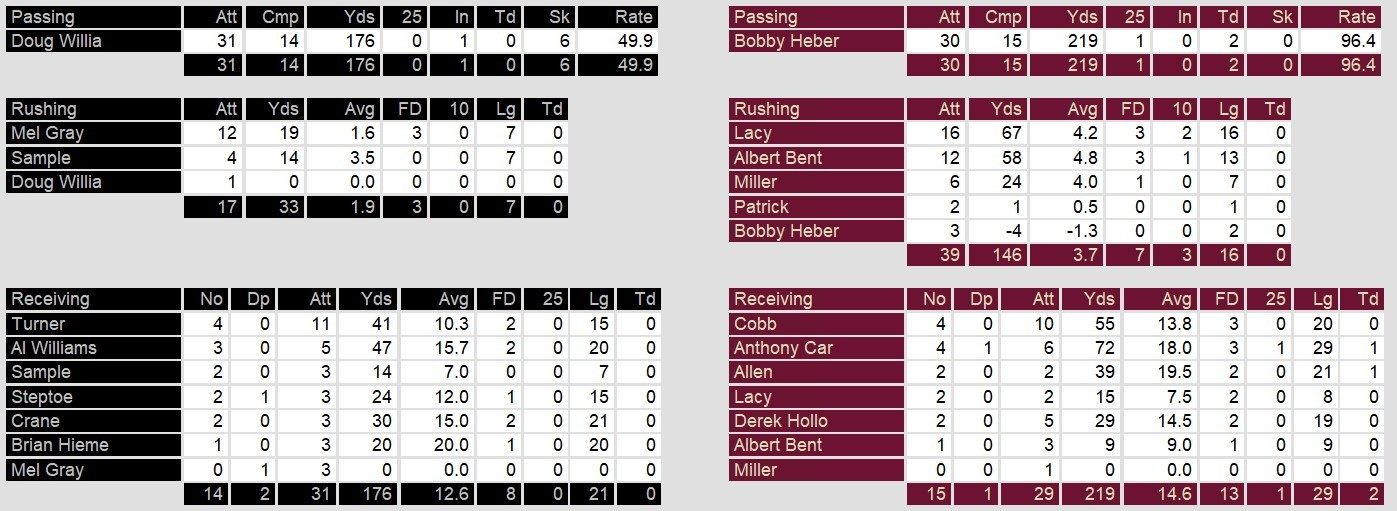 Michigan’s defense was stellar, limiting Oklahoma to just 166 yards of total offense and sacking Doug Williams six times. The Outlaws’ offense struggled throughout the game, with their running game held to a mere 33 yards on 17 carries. Doug Williams was under constant pressure, completing only 14 of 31 passes for 176 yards and an interception. Oklahoma’s inability to sustain drives was evident, as they converted just 3 of 13 third-down attempts and were shut out in the red zone.