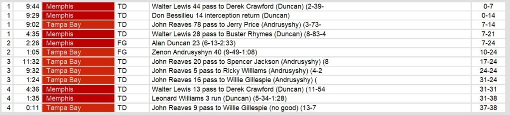 The Memphis Showboats held on for a thrilling 38-37 victory over the Tampa Bay Bandits in a Week 4 showdown that saw multiple lead changes and a dramatic finish. Memphis came out firing in the first quarter, with quarterback Walter Lewis connecting on two long touchdown passes to Derek Crawford and Buster Rhymes, while Don Bessilieu added a 14-yard interception return for a score. Despite an early 21-7 deficit, Tampa Bay fought back with a 78-yard touchdown pass from John Reaves to Jerry Price, keeping them within striking distance.