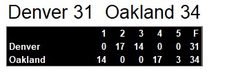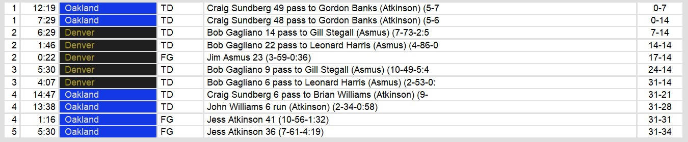 In the third quarter, Denver extended their lead to 31-14 with Gagliano connecting again with Gill Stegall and Leonard Harris for touchdowns. But the Invaders refused to back down, mounting a dramatic fourth-quarter comeback. Sundberg led Oakland on two consecutive touchdown drives, cutting the deficit to 31-28. A 41-yard field goal by Jess Atkinson with just over a minute left in regulation sent the game into overtime, where Atkinson sealed the victory with a 36-yard field goal.
