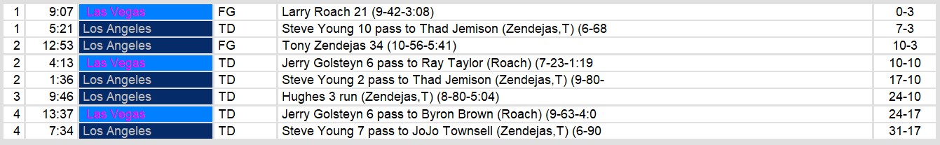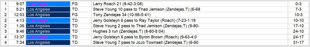 The Los Angeles Express secured a 31-17 victory over the Las Vegas Ace at Sam Boyd Stadium, thanks to a commanding performance by quarterback Steve Young. The Express quickly recovered from a first-quarter interception, with Young connecting on two touchdown passes to Thad Jemison, establishing a 17-10 halftime lead. Young’s precision passing, which saw him accumulate 394 yards on 30 completions, kept the Las Vegas defense on its heels throughout the game.
