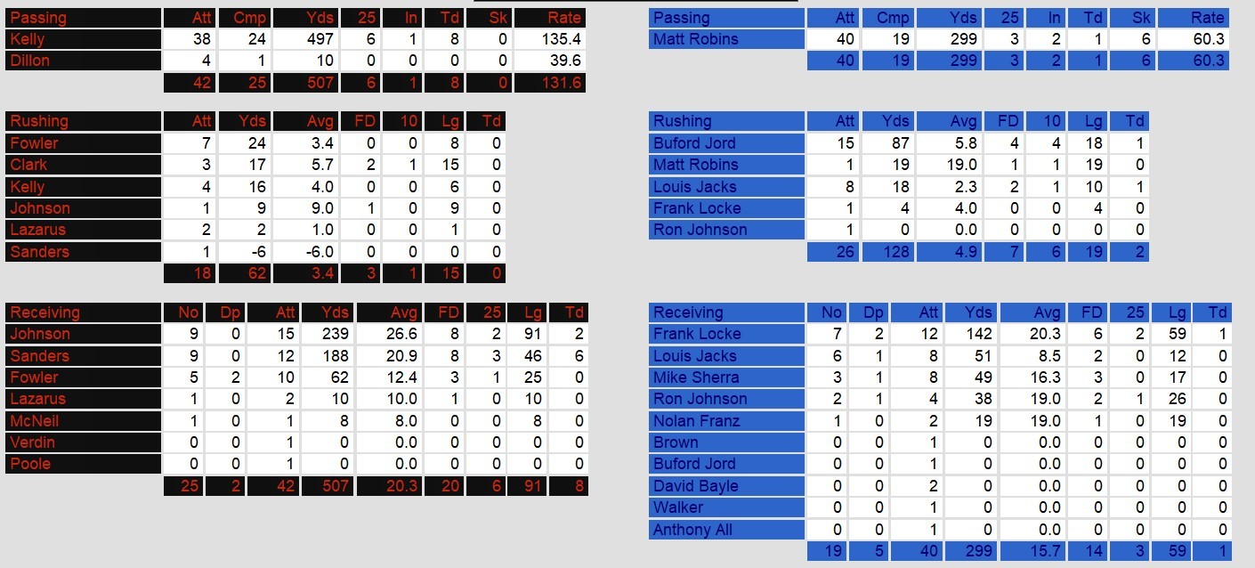 Boston initially took the lead in the first quarter with a 7-yard touchdown run by Louis Jackson, but their momentum quickly evaporated as Houston responded with a relentless offensive onslaught. Kelly and Sanders connected for four touchdowns in the second quarter alone, with additional scoring strikes to Richard Johnson, including a 91-yard bomb that highlighted Houston’s explosive potential. The Breakers’ defense, despite their best efforts, had no answer for Kelly’s arm or the Gamblers’ wide receiver duo, leading to a lopsided halftime score of 44-7.