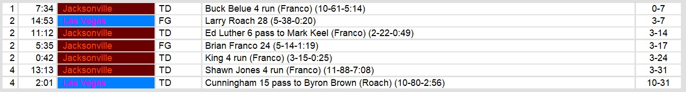 Despite a late touchdown from the Ace, a 15-yard pass from Cunningham to Byron Brown, Las Vegas remained winless on the season, falling to 0-5. The Ace struggled to generate momentum, managing only 201 yards of total offense and converting just 4 of 15 third downs. Jacksonville’s defense, led by Derek Batiste’s interception and Doug West’s sack, kept the pressure on all game, ensuring the Bulls secured a comfortable victory in front of their home crowd.