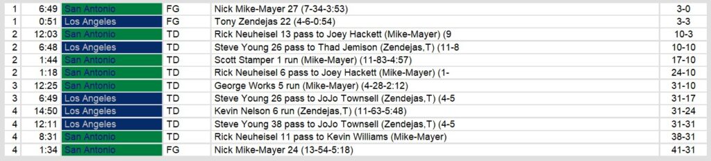 Los Angeles, led by Steve Young, mounted a fierce second-half comeback. Young connected with JoJo Townsell for two long touchdowns and helped tie the game 31-31 in the fourth quarter. Kevin Nelson also chipped in with a six-yard touchdown run as the Express fought to erase the deficit. However, Neuheisel and the Gunslingers responded with an 11-yard touchdown pass to Kevin Williams, followed by a Mike-Mayer field goal to seal the victory.