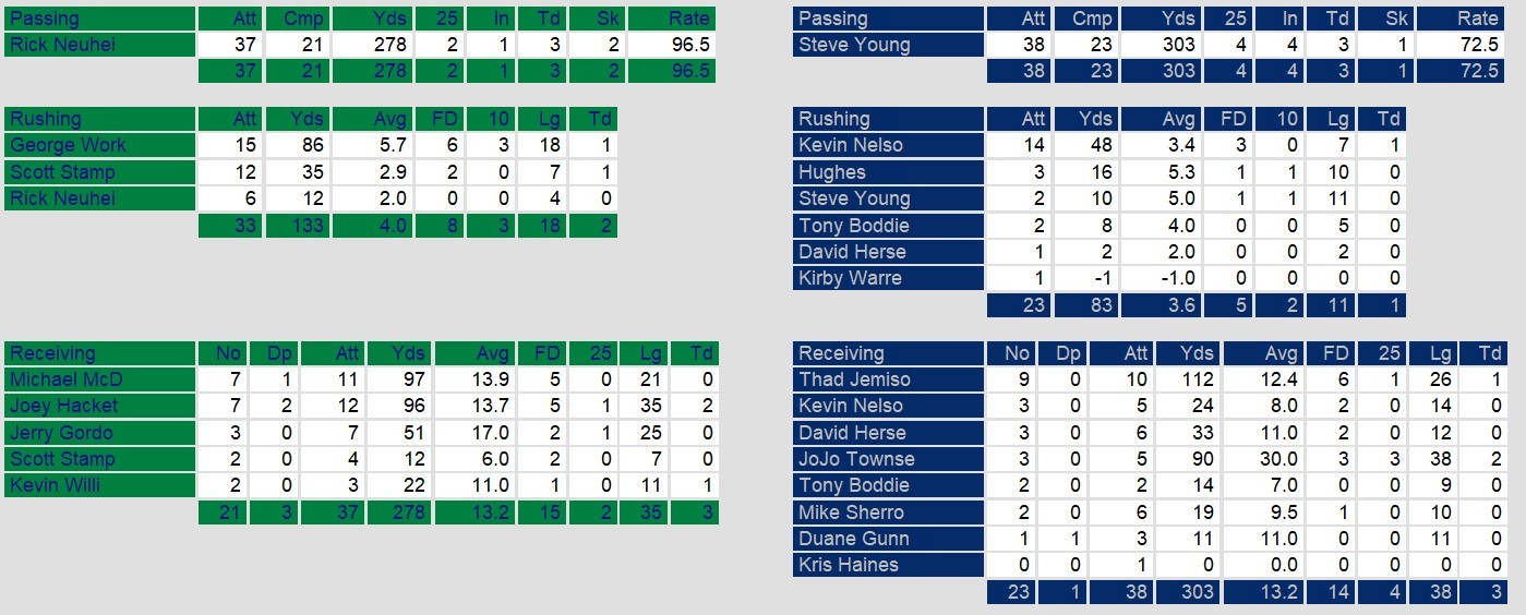 Los Angeles, led by Steve Young, mounted a fierce second-half comeback. Young connected with JoJo Townsell for two long touchdowns and helped tie the game 31-31 in the fourth quarter. Kevin Nelson also chipped in with a six-yard touchdown run as the Express fought to erase the deficit. However, Neuheisel and the Gunslingers responded with an 11-yard touchdown pass to Kevin Williams, followed by a Mike-Mayer field goal to seal the victory.