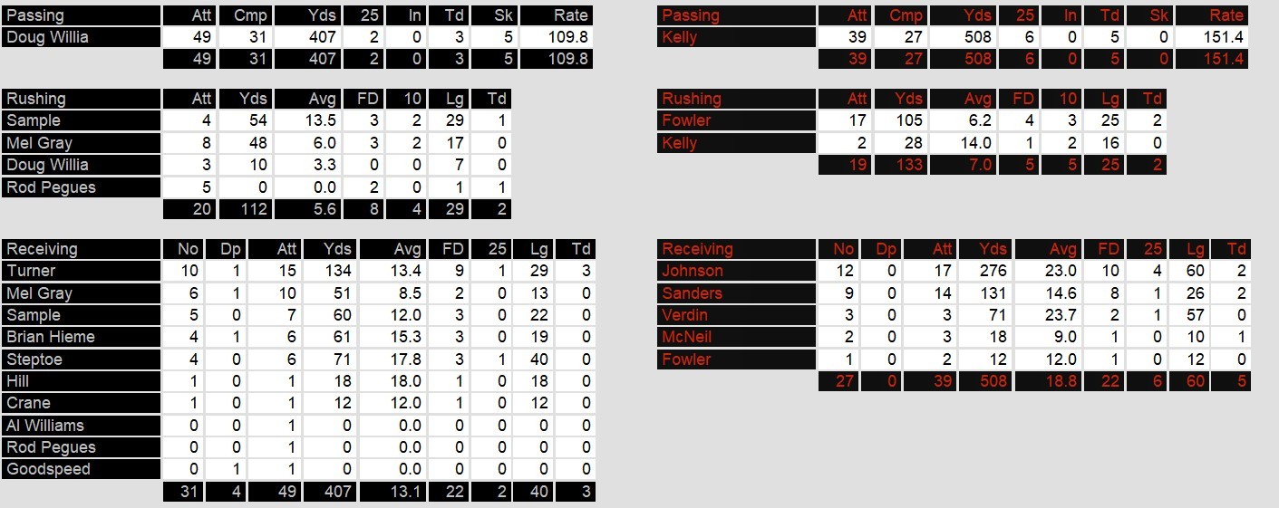 The second quarter saw the Gamblers begin to pull away, as Kelly orchestrated two more touchdown drives, highlighted by a 37-yard bomb to Johnson and a 26-yard pass to Sanders. The Outlaws, however, refused to go quietly, with Doug Williams finding Turner for their third touchdown connection of the day, keeping the game within reach at halftime. Yet, every time Oklahoma seemed poised to make a comeback, Houston had an answer. Running back Sam Fowler added two rushing touchdowns, and the Gamblers’ defense chipped in with a fumble recovery returned for a touchdown by Will Lewis late in the fourth quarter, sealing the win.