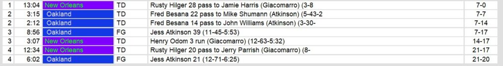 Oakland extended their advantage with a field goal early in the third quarter, but the resilient Brass answered back. Henry Odom powered his way into the end zone with a 3-yard rushing touchdown to bring New Orleans within three points. In the fourth quarter, Hilger delivered again, this time connecting with Jerry Parrish on a 20-yard touchdown pass that ultimately put the Brass ahead 21-17. Oakland managed to close the gap with another field goal, but their final drive was stalled by a determined New Orleans defense.