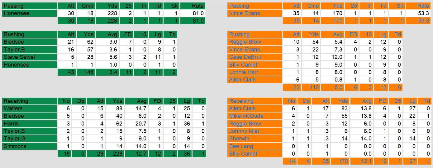 In the third quarter, Washington’s momentum continued when quarterback Ed Honensee connected with wide receiver Reggie Harris on a 36-yard touchdown pass, giving the Federals a 14-9 advantage. Arizona’s offense struggled to capitalize on opportunities, and Washington controlled the clock with a punishing 15-play, 97-yard drive that ate up over seven minutes. The drive ended with a seven-yard touchdown run by Steve Sewell, stretching the lead to 21-9.