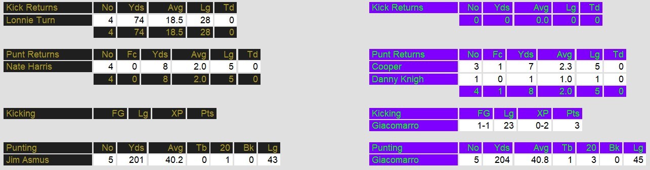 New Orleans’ defense was the true star of the day, forcing three turnovers and keeping Denver off the scoreboard despite several long drives. Reggie Phillips and Mike Guess each recorded critical interceptions, with Phillips’ 26-yard return setting up the field goal that helped extend the Brass’ lead. The unit was relentless, holding Denver quarterback Bob Gagliano to just 189 passing yards and intercepting him three times. The Gold failed to convert in the red zone, coming away empty-handed on every opportunity.