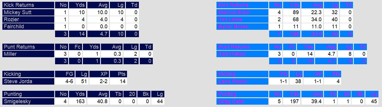 The Pittsburgh Maulers improved to 5-3 with a steady 26-10 victory over the winless Las Vegas Ace at Sam Boyd Stadium. Pittsburgh controlled the game from the start, with running back Mike Rozier leading the way, rushing for 144 yards and a touchdown on 24 carries. Quarterback Brian Sipe added another touchdown on a 4-yard run, while kicker Steve Jordan was reliable, hitting four field goals, including a 51-yarder. Despite several missed opportunities, the Maulers’ defense forced six turnovers to keep Las Vegas at bay.