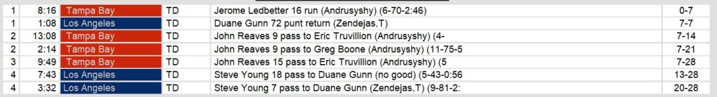 In the third quarter, Reaves connected with Truvillion again for a 15-yard touchdown, extending Tampa Bay’s lead to 28-7. The Express, led by quarterback Steve Young, struggled to generate offense as they were sacked 12 times and committed four turnovers. Despite the pressure, Young found Gunn for two fourth-quarter touchdowns, one from 18 yards and another from 7 yards, but it wasn’t enough to complete the comeback.