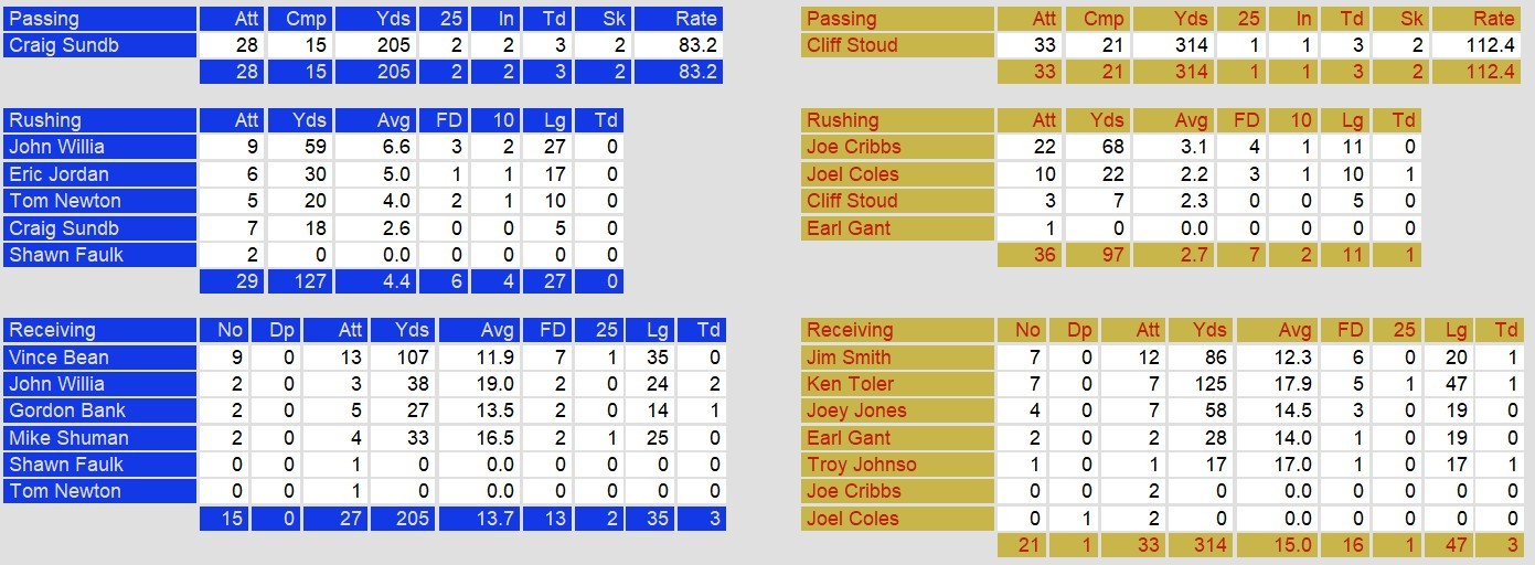 In the second half, the Stallions extended their lead with a four-yard rushing touchdown from Joel Coles, but Oakland fought back. Sundberg found John Williams for two fourth-quarter touchdowns, the second of which gave the Invaders a 25-21 lead with just under two minutes remaining. Oakland’s defense had tightened up, but Stoudt orchestrated a quick two-play, 64-yard drive, capped by a 17-yard touchdown pass to Troy Johnson to reclaim the lead for Birmingham.