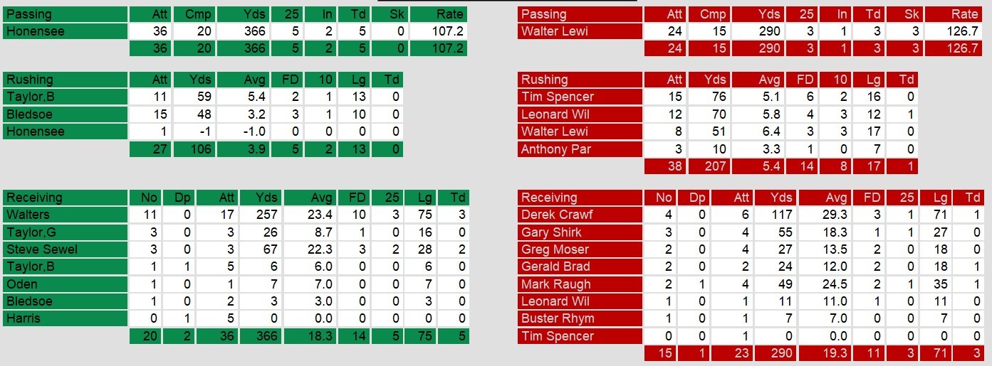 The game began explosively, with both teams trading touchdowns early, highlighted by a 71-yard strike from Lewis to Derek Crawford and a 54-yard touchdown from Honensee to Walters. Memphis appeared to seize momentum in the second quarter, leading 24-14 after a fumble return touchdown by Ray Odums. But Washington rallied back quickly, with a crucial 75-yard touchdown pass from Honensee to Walters and a last-minute score to close the first half trailing just 24-21.
