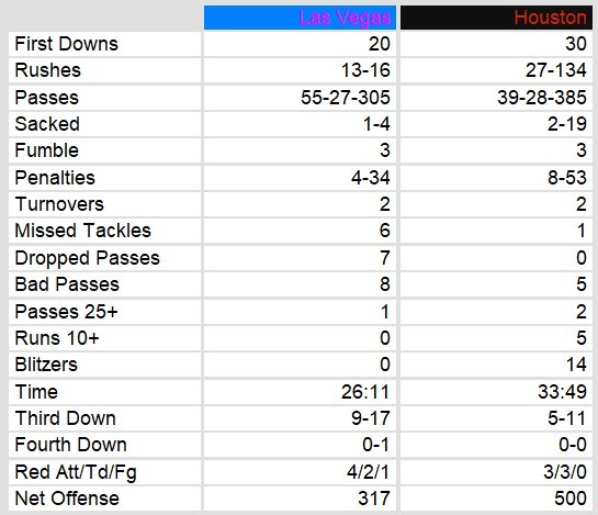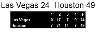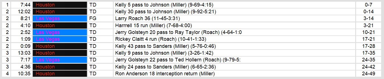 Las Vegas showed signs of life in the second quarter, scoring 17 points, including a 20-yard touchdown pass from Jerry Golsteyn to Ray Taylor and a 4-yard rushing score by Rickey Claitt. However, Houston responded quickly, with Kelly connecting on a 43-yard bomb to Sanders just before halftime to make it 28-17. In the second half, Kelly threw two more touchdown passes, and Ron Anderson sealed the game with an 18-yard interception return for a score early in the fourth quarter.