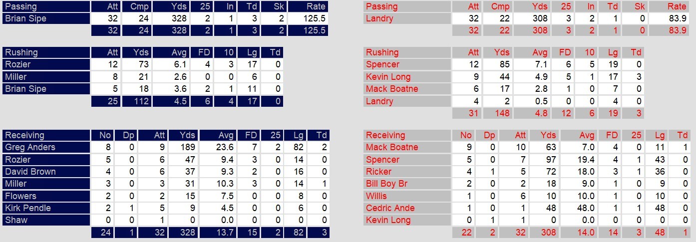 Pittsburgh struggled offensively for most of the game but came alive in the fourth quarter. Down 31-0, Sipe led the Maulers on a furious rally, throwing three touchdown passes. Greg Anderson was Sipe’s go-to receiver, recording 189 yards and two long touchdowns, including an 82-yarder with just 25 seconds left. Despite their late surge, the Maulers couldn’t overcome Chicago’s early dominance.