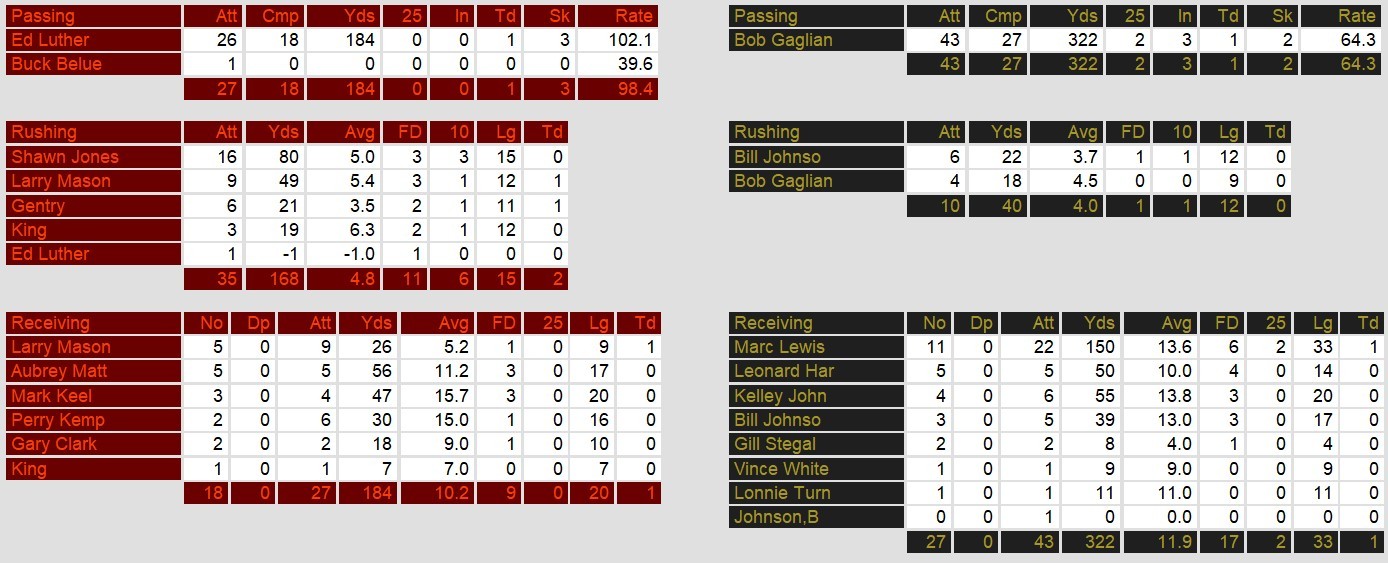 The Jacksonville Bulls cruised to a 26-7 victory over the Denver Gold at Mile High Stadium, dominating on both sides of the ball. Larry Mason led the charge, scoring two touchdowns—one on the ground and one through the air—earning MVP honors. The Bulls jumped out to an early lead with a 9-yard touchdown pass from Ed Luther to Mason in the first quarter. A pair of field goals from Brian Franco extended the lead to 13-7 by halftime, as Denver’s lone score came on a 4-yard pass from Bob Gagliano to Marc Lewis.