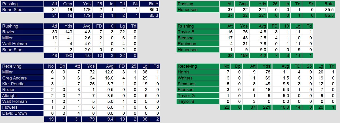 The Pittsburgh Maulers pulled off a dramatic 26-20 overtime victory over the Washington Federals at RFK Memorial Stadium. Pittsburgh opened the scoring with a 47-yard field goal from Steve Jordan, but Washington quickly responded with a 7-yard rushing touchdown by Brian Taylor, taking a 7-3 lead at the end of the first quarter. In the second quarter, Pittsburgh struck back with a 61-yard fumble recovery touchdown by Mike McKibben, but Washington’s offense surged ahead with a 20-yard touchdown pass from Honensee to Harris and a late field goal, leading 17-10 at halftime.