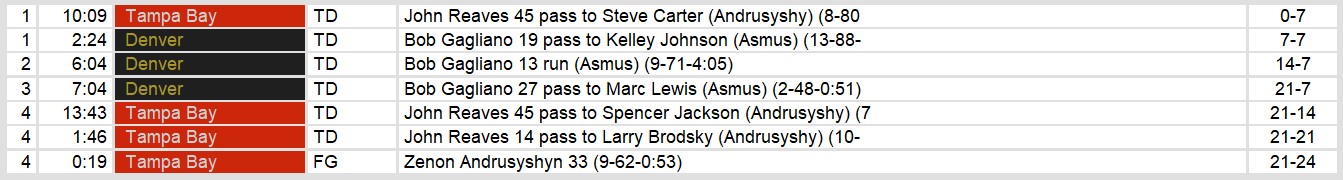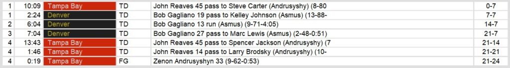 Denver extended their lead to 21-7 in the third quarter after Gagliano connected with Marc Lewis on a 27-yard touchdown pass. However, the Bandits rallied in the fourth quarter. Reaves threw a 45-yard touchdown pass to Spencer Jackson to pull Tampa Bay within a score. Then, with under two minutes left, Reaves delivered again, finding Larry Brodsky for a 14-yard touchdown to tie the game at 21-21.
