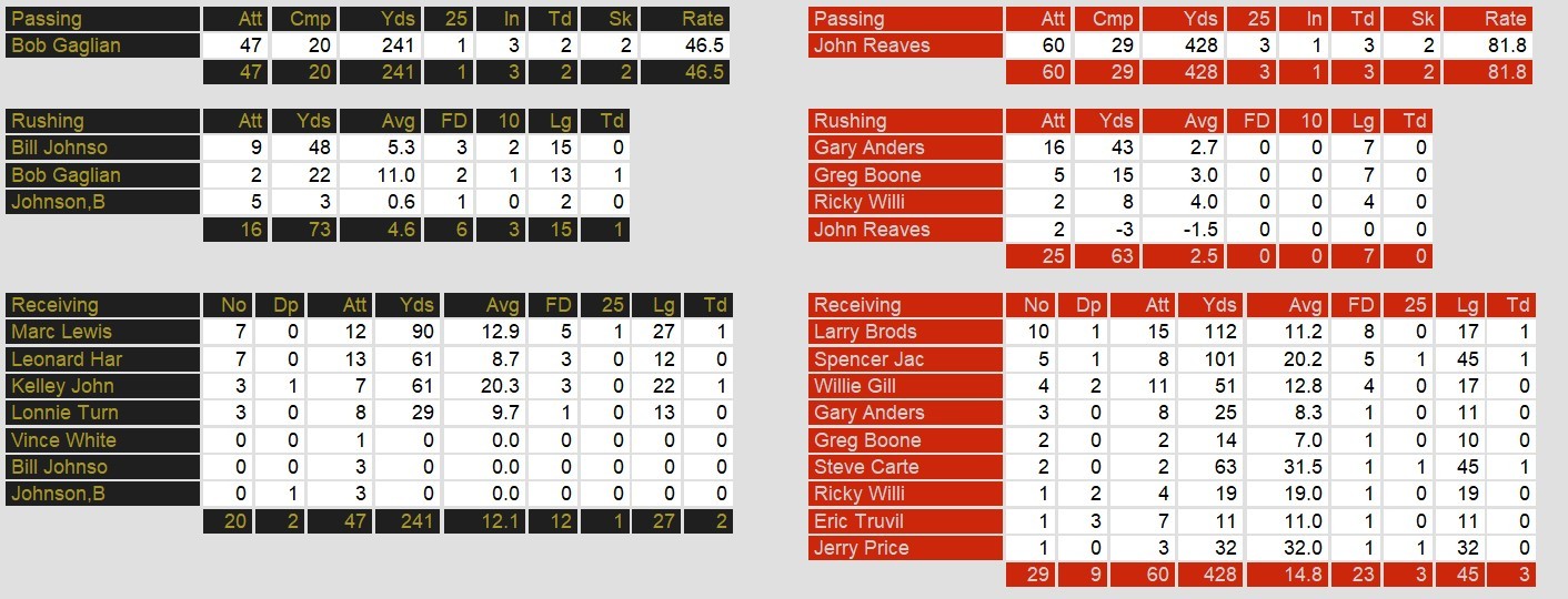 The Tampa Bay Bandits staged a dramatic comeback to edge the Denver Gold 24-21 in a rain-soaked battle at Tampa Stadium. Tampa Bay opened the scoring with a 45-yard touchdown pass from John Reaves to Steve Carter, but Denver responded with a 19-yard touchdown strike from Bob Gagliano to Kelley Johnson to tie the game at 7-7. The Gold took control in the second quarter when Gagliano scored on a 13-yard run, giving them a 14-7 halftime lead.