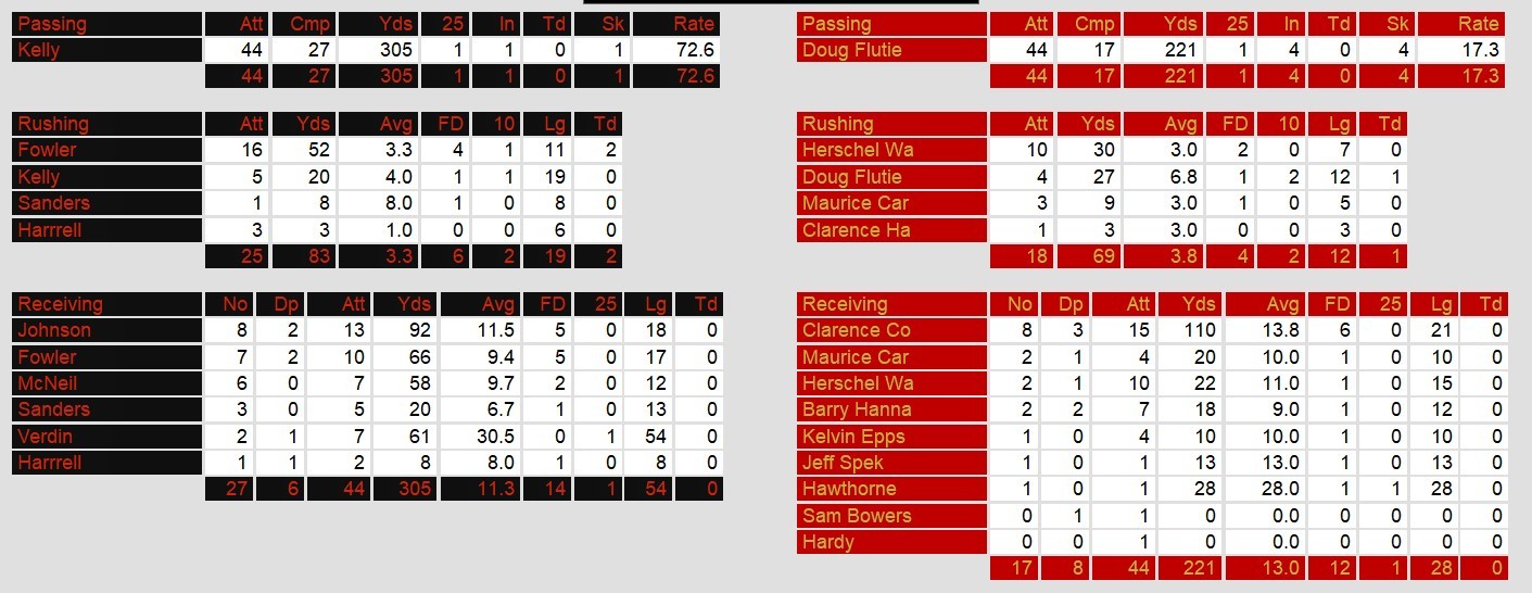 In the third quarter, Houston extended its lead with another touchdown from Fowler, this time a 2-yard run, capping an 11-play, 72-yard drive. The Generals struggled to move the ball, with Flutie facing relentless pressure, getting sacked four times. The Houston defense forced five turnovers, including three interceptions. Fowler finished with 52 yards and two touchdowns on the ground, while quarterback Jim Kelly threw for 305 yards but was unable to find the end zone through the air.