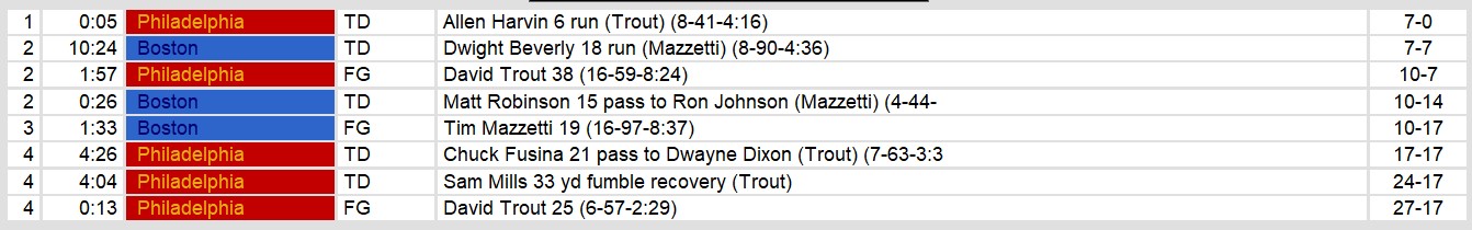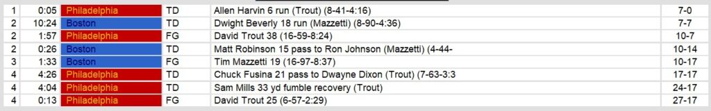 Boston continued to apply pressure in the third quarter, extending their lead to 17-10 with a 19-yard field goal from Tim Mazzetti after a long, clock-chewing drive. However, Philadelphia came alive in the fourth quarter. Quarterback Chuck Fusina connected with Dwayne Dixon on a 21-yard touchdown pass to tie the game at 17-17. Just moments later, linebacker Sam Mills scored a pivotal 33-yard fumble recovery touchdown, turning the tide in Philadelphia’s favor. The Stars sealed the game with another Trout field goal in the closing seconds, ending the contest 27-17.