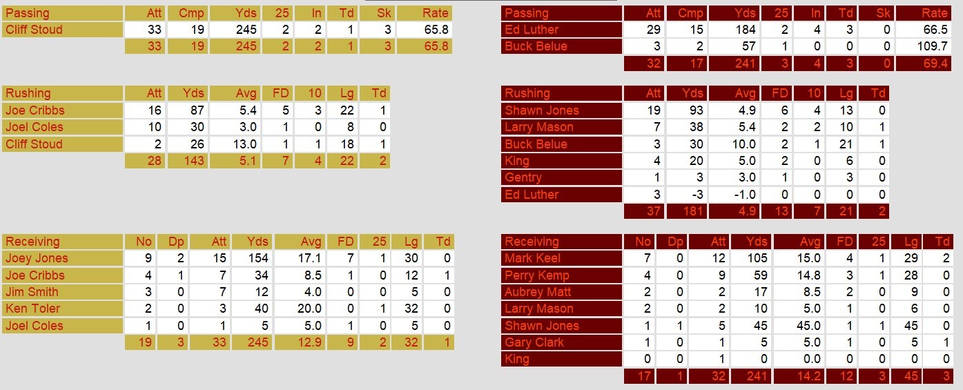Jacksonville roared back, however, behind a spectacular outing from MVP Mark Keel and a relentless defensive effort. After a 9-yard touchdown run from Buck Belue closed the gap to 27-21, the Bulls took control early in the fourth quarter. Ed Luther’s quick 5-yard touchdown pass to Gary Clark pushed Jacksonville ahead, and shortly afterward, Adam Hinds picked off Stoudt and returned it 47 yards for another score, putting the Bulls up 35-27. The Stallions couldn’t respond, with Jacksonville’s ground game and aggressive defense stifling their attempts to close the gap.