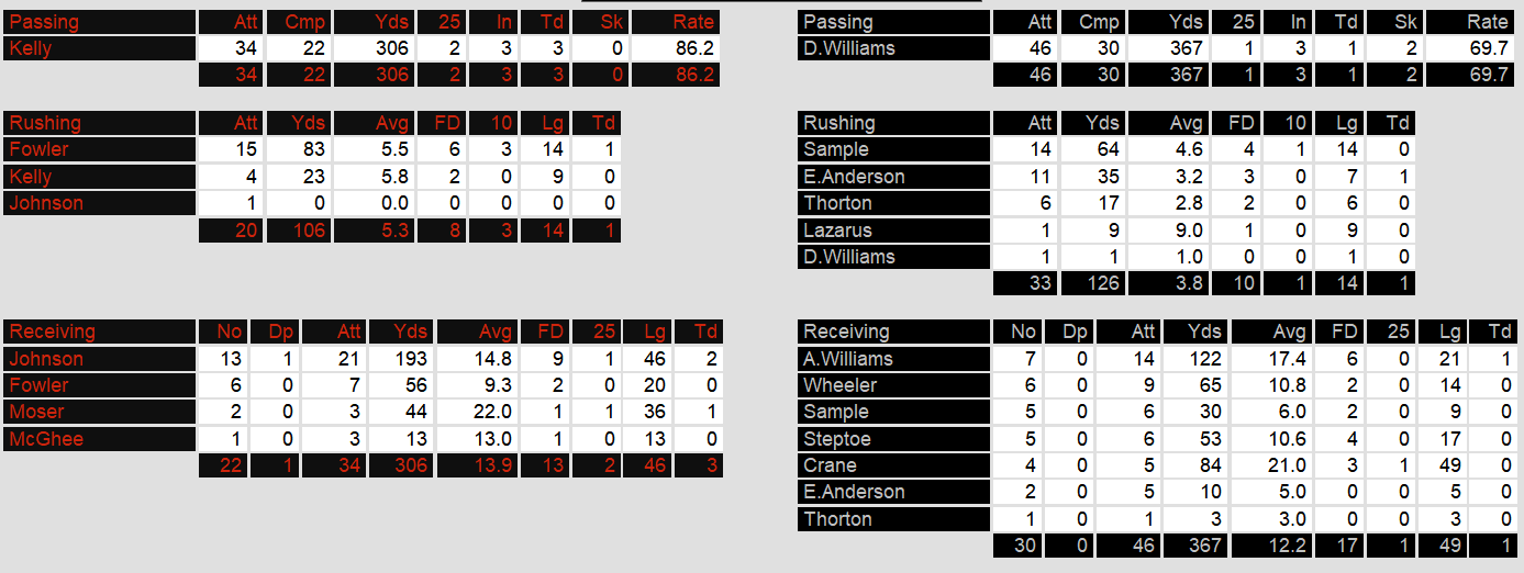 The Panthers clawed back in the third quarter as Hebert connected with Cobb for a 15-yard score, and Novo Bojovic added a short field goal, putting Michigan ahead 27-23. Houston’s offense sputtered, with Jim Kelly throwing two interceptions, but their defense held firm, keeping the Panthers out of the end zone. In the fourth quarter, Kelly orchestrated a methodical 12-play, 72-yard drive that ended in his two-yard touchdown run, putting the Gamblers back on top 30-27. Michigan had one last chance but failed to convert on a long field goal attempt.