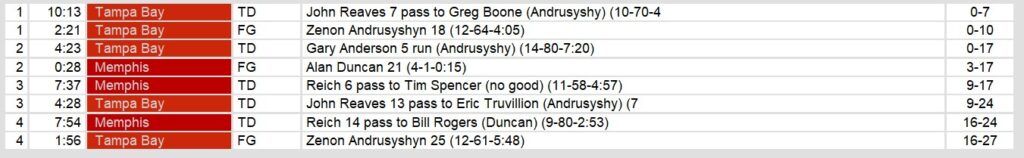 The Showboats found some rhythm in the second half behind quarterback Mike Reich. Reich connected with Tim Spencer for a 6-yard touchdown in the third quarter, cutting the deficit to 17-9 after a missed extra point. Tampa Bay responded with Reaves finding Eric Truvillion for a 13-yard touchdown, reinstating a two-score cushion. Memphis fought back in the fourth, with Reich hitting Bill Rogers for a 14-yard score to make it a one-possession game. However, the Bandits sealed the victory with a clock-killing 12-play drive culminating in another Andrusyshyn field goal.