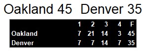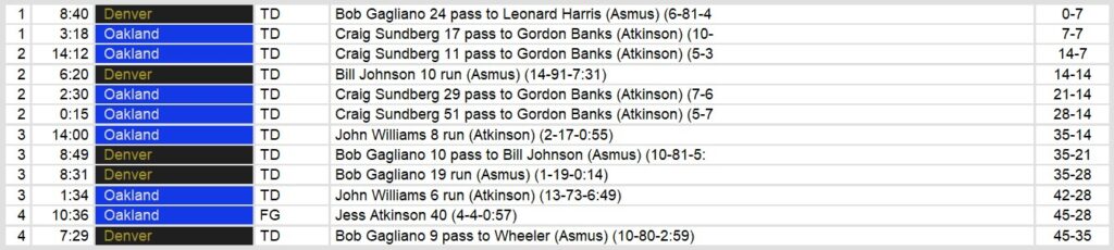 Denver battled back behind quarterback Bob Gagliano, who threw for 283 yards and three touchdowns while adding a 19-yard rushing score. Running back Bill Johnson chipped in with 91 rushing yards and a touchdown, spearheading a Denver ground game that averaged 7.1 yards per carry. Despite their offensive efforts, turnovers and missed opportunities plagued the Gold, including a critical missed field goal and two interceptions by Gagliano. Denver cut the lead to 35-28 in the third quarter, but Oakland’s John Williams responded with his second rushing touchdown of the day to put the game out of reach.